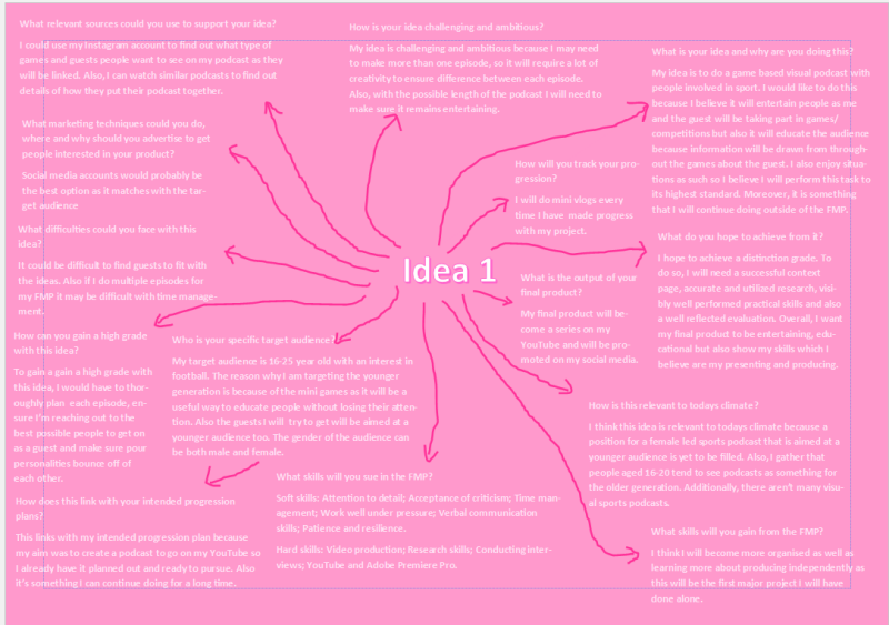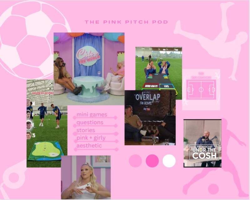 For my final idea I have decided to select 'The Pink Pitch Pod' as my FMP project. The reason I chose this to put hard work and effort into is because not only do I believe it is a unique idea, it is a project I desire to continue expanding beyond the final major project. My personality and presenting skills will morph well into this visual podcast and I aim to improve my planning, filming and editing skills whilst making this piece.